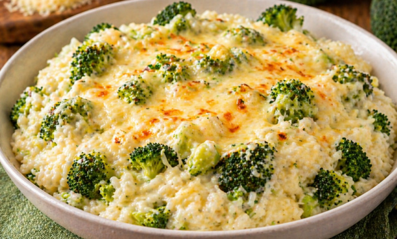Sirva imediatamente, ainda quente, com o queijo derretido e o brócolis verde vibrante em contraste com o arroz branco — uma apresentação naturalmente bonita e apetitosa.