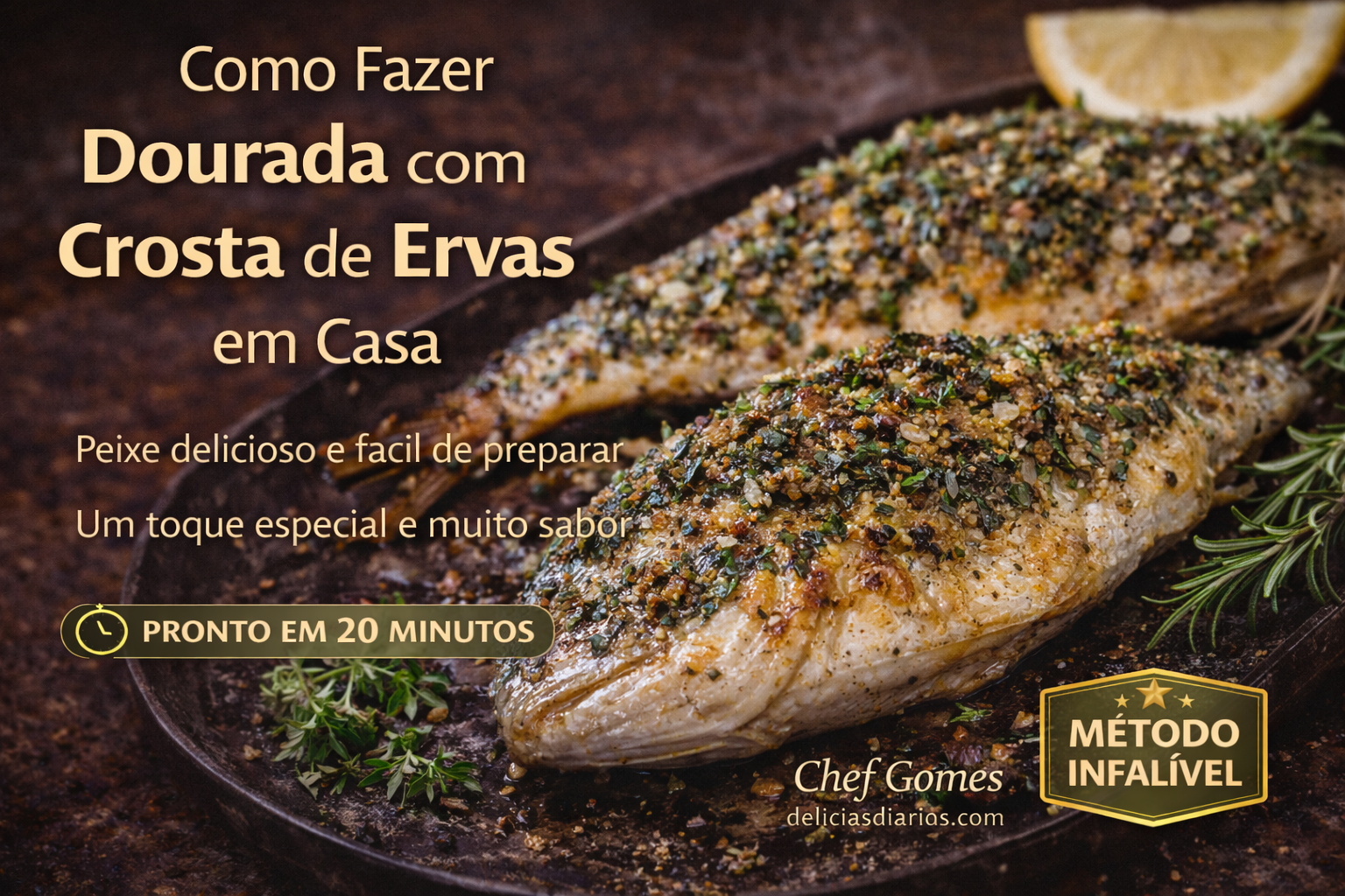 A dourada assada com crosta de ervas é uma receita que entrega resultado de restaurante com preparo doméstico simples. O peixe fica suculento por dentro, protegido por uma camada crocante e aromática de ervas frescas, alho e azeite que sela os sucos naturais durante o assamento.