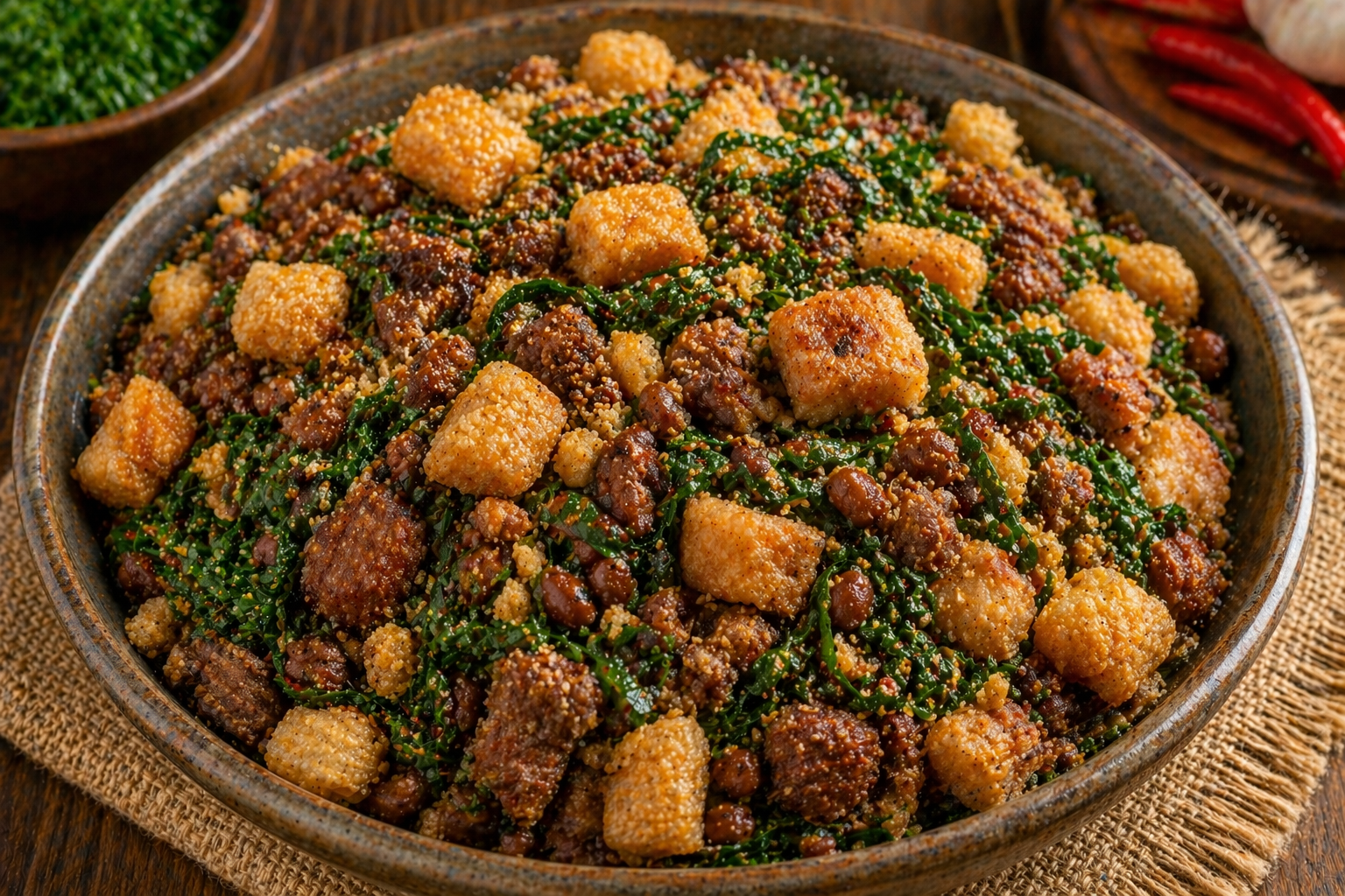 Não é enfeite — é parte estrutural da receita. O contraste entre o feijão úmido com farinha e o torresmo que crocanta na mordida é o que torna o tropeiro diferente de qualquer outra preparação com feijão. Sem torresmo crocante, é outro prato.