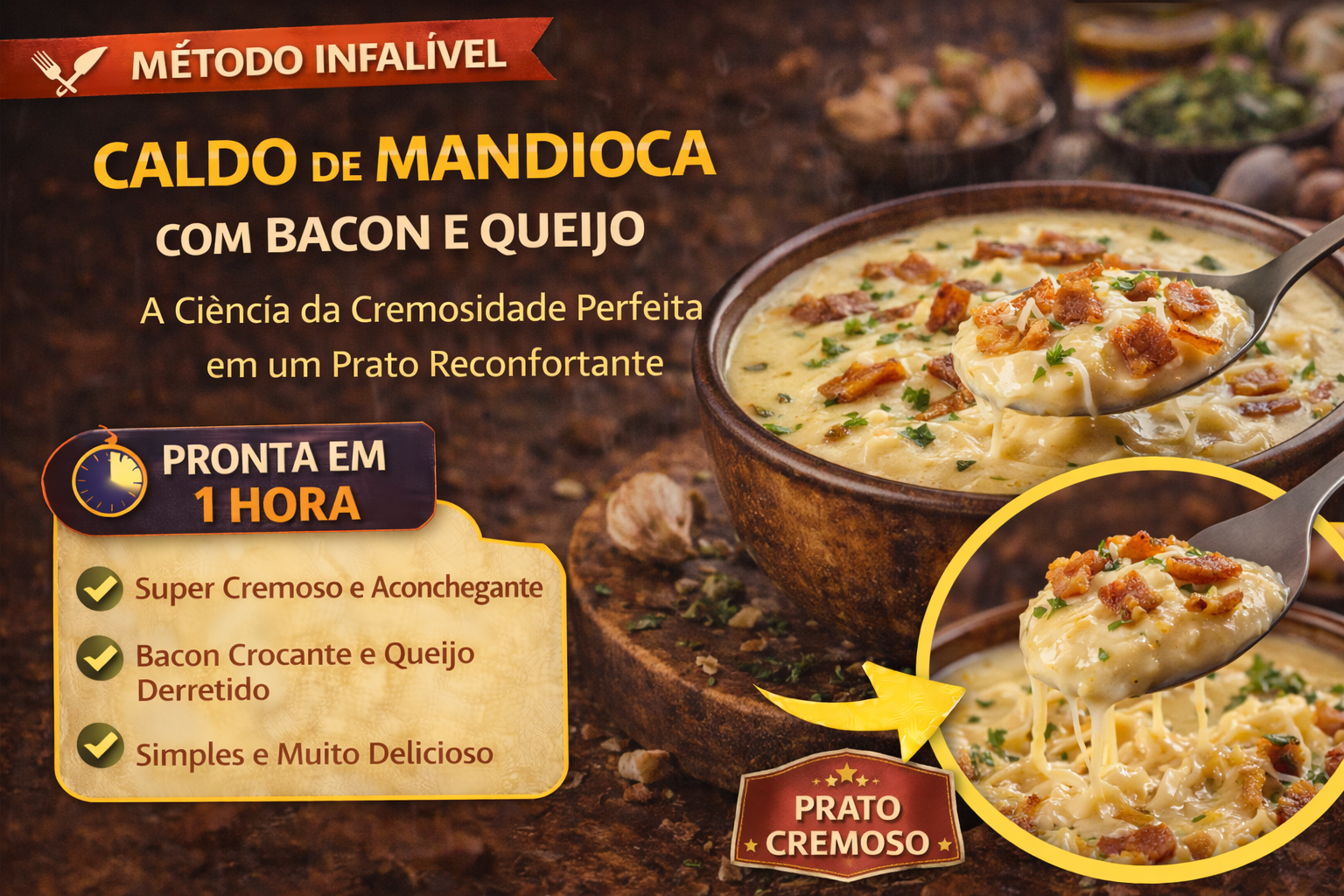 Existe um tipo de prato que vai além da nutrição e alcança algo mais profundo — o conforto genuíno. O caldo de mandioca com bacon e queijo é exatamente isso: uma receita que combina a cremosidade natural do amido da mandioca com a intensidade defumada do bacon e a untuosidade do queijo derretido, criando uma experiência sensorial completa em cada colherada. Mas há uma diferença enorme entre um caldo ralo e sem graça e um caldo encorpado, sedoso e cheio de camadas de sabor — e essa diferença está inteiramente na técnica.