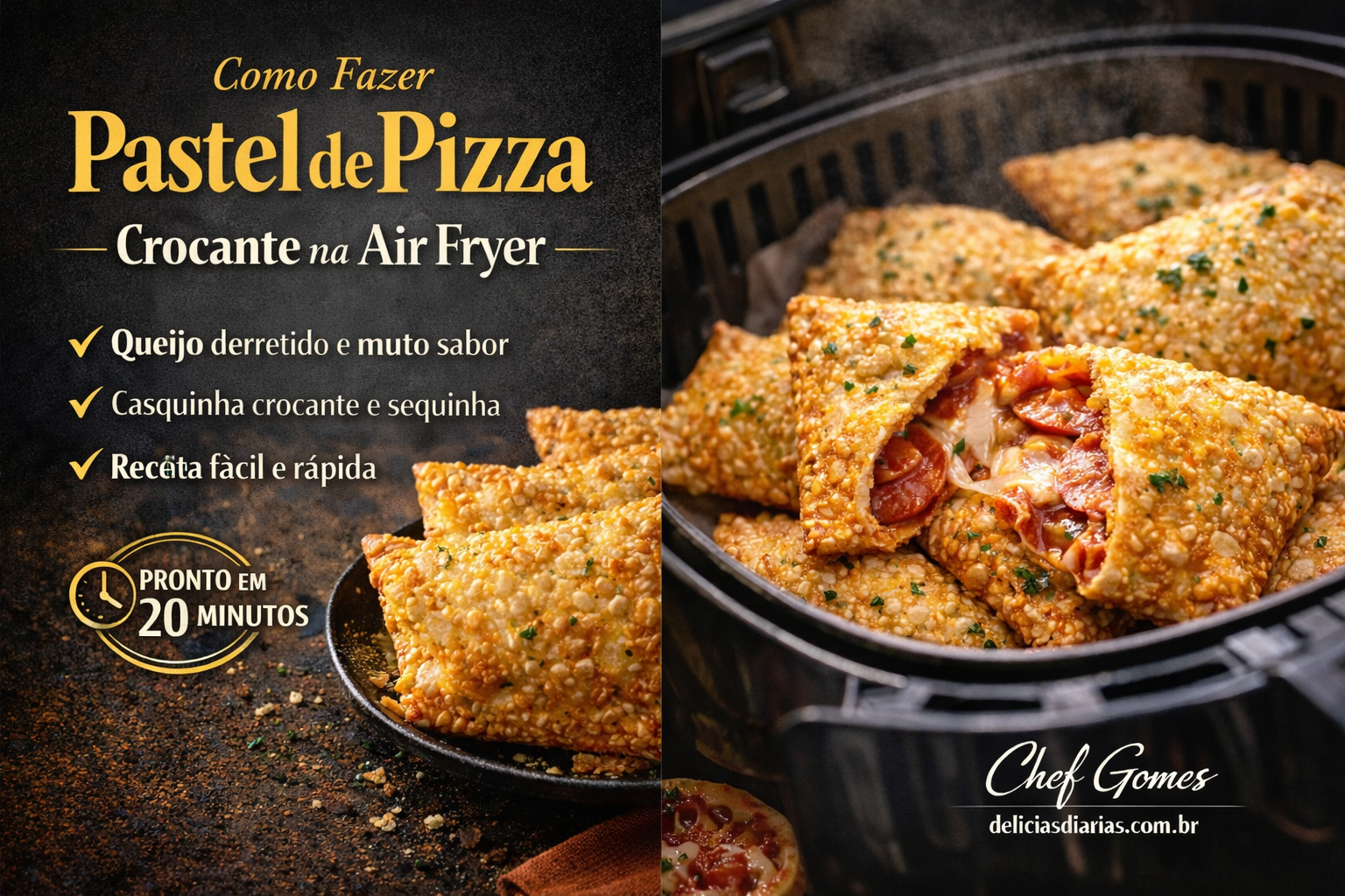 É uma receita que resolve o lanche da tarde, o aperitivo de fim de semana e até a entrada de uma reunião de amigos. Com massa caseira simples, recheio acessível e Air Fryer, o resultado é um pastel dourado, crocante e com aquele recheio que estica ao abrir — exatamente como deve ser.