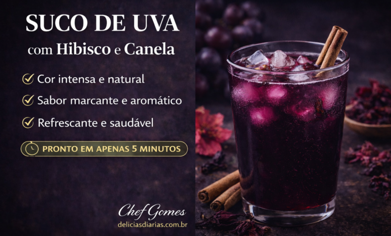 - Suco de uva com hibisco e gengibre: substitua a canela por um pedaço pequeno de gengibre fresco ralado — cerca de 1 cm. O resultado é mais picante e refrescante, com perfil diferente da versão com canela. Ideal para quem prefere bebidas mais vibrantes.