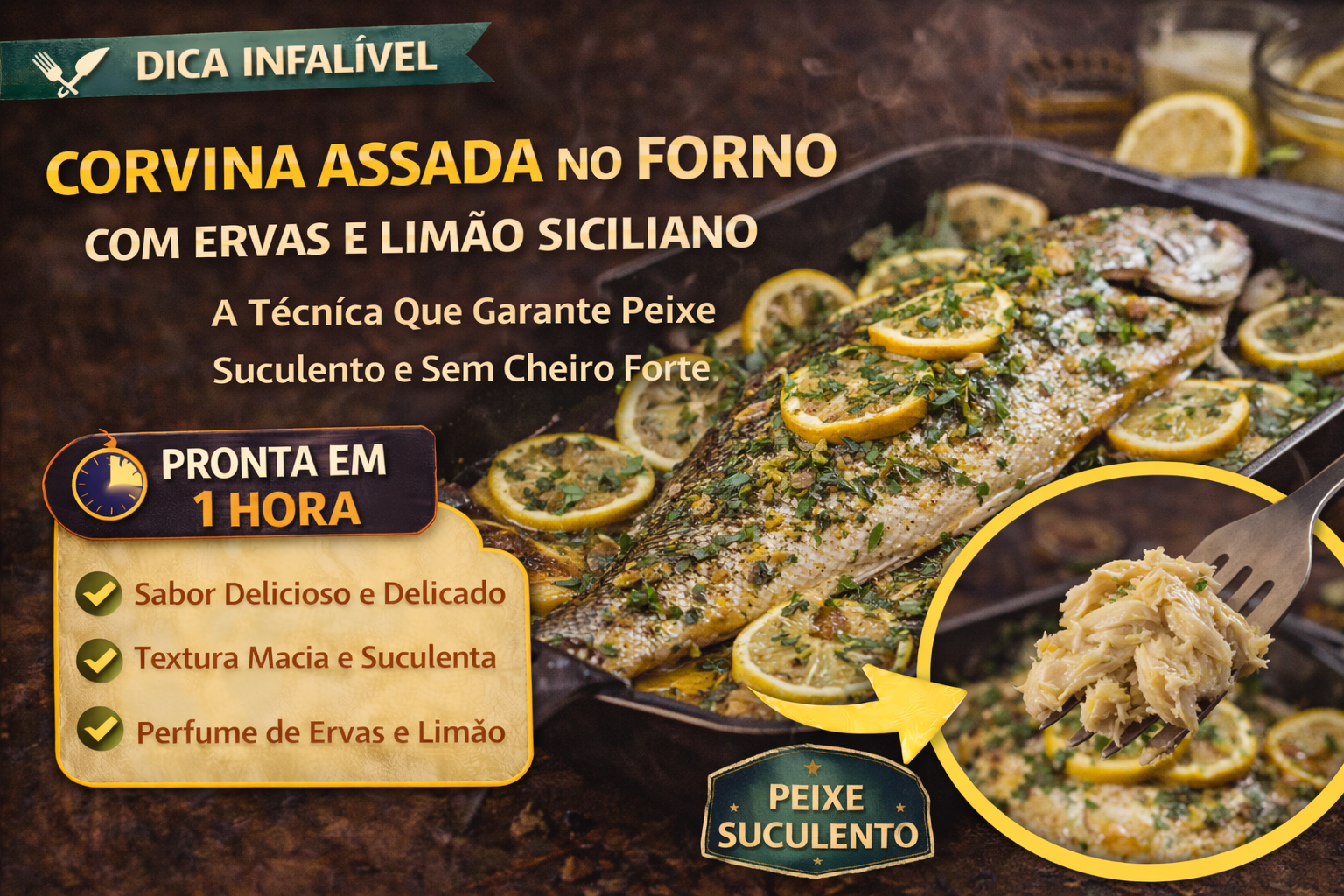 A corvina assada no forno com ervas e limão siciliano é um daqueles pratos que parecem simples mas exigem atenção técnica em cada etapa — da escolha do peixe ao descanso pós-forno. Quando feito corretamente, o resultado é um prato de sabor limpo, textura impecável e aroma que transforma qualquer refeição em uma experiência gastronômica real.
