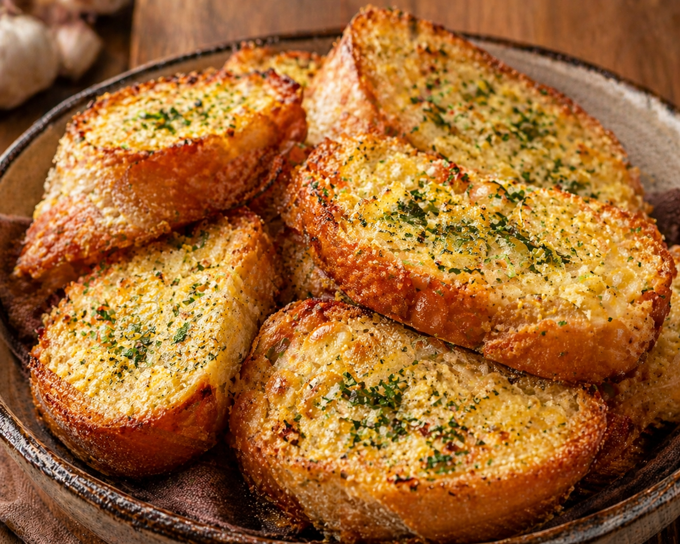 Sirva imediatamente — o pão de alho perde a crocância da casca e o queijo endurece rapidamente conforme esfria.
